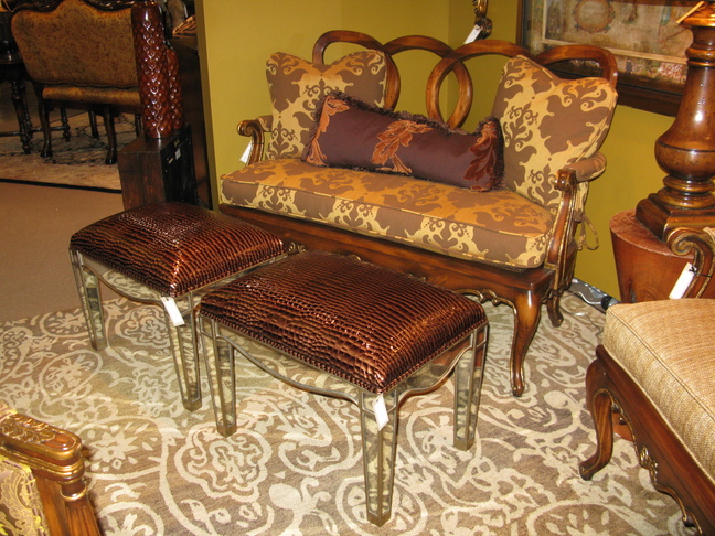 This weekend I went to the Boulevard of Dreams Green Living Show Home here in Kansas City. The home was gorgeous, especially the dining room. What initally caught my attention was the groin vault ceiling that had some sort of metallic finish and the fact that the chandelier was the same as what I have in my dining room. However, what really took my breath were the two dining end chairs. The chairs had a blackish distressed finish with crocodile embossed leather seat and back cushion with nailhead trim. What was really unique was the animal hide on back of the chairs. The hide was shaved in areas, making an interesting pattern on the back. This was because the hair on the hide was light in color and the hide skin itself was dark, so the shaved areas were dark pops of color against the lighter hair. The chairs had ornate carved detailing along the top and the chair base. I think they were spectacular.